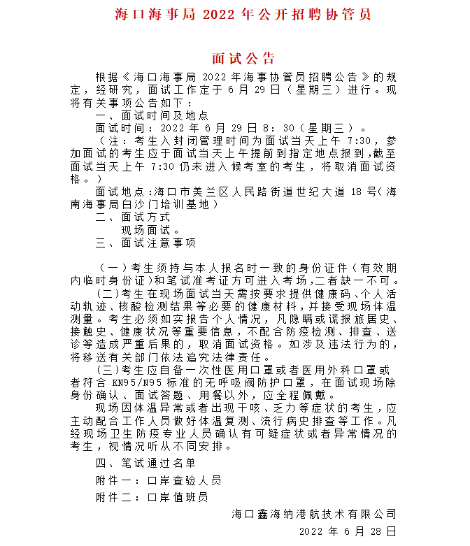 海口海事局2022年公開招聘協(xié)管員面試公告 根據(jù)《??诤J戮?022年海事協(xié)管員招聘公告》的規(guī)定,經(jīng)研究,面試工作定于6月29日(星期三)進(jìn)行?,F(xiàn)將有關(guān)事項(xiàng)公告如下:一、面試時(shí)間及...2022-06-28點(diǎn)擊:65 -