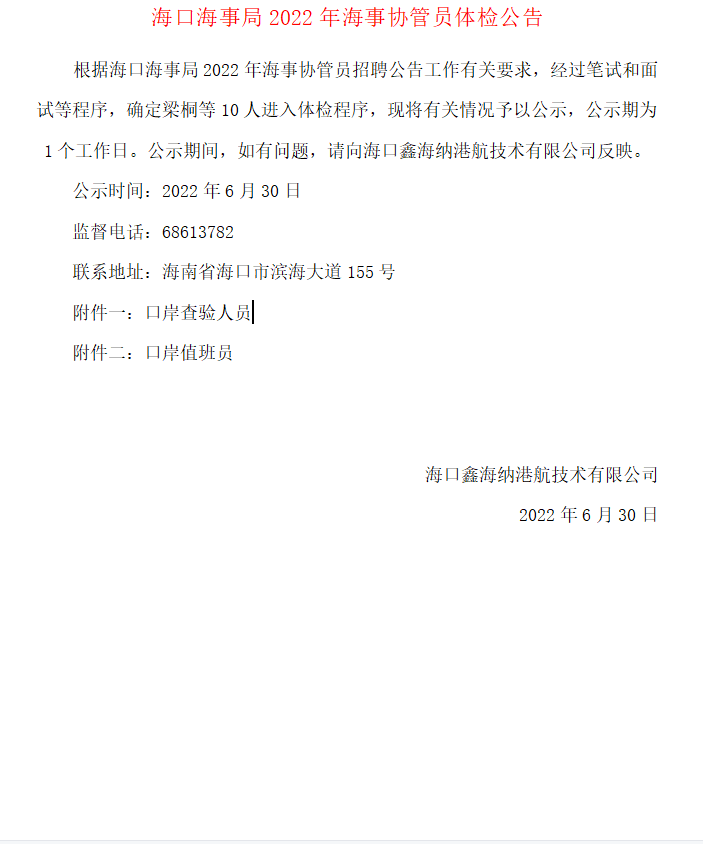 ??诤J戮?022年海事協(xié)管員體檢公告根據(jù)海口海事局2022年海事協(xié)管員招聘公告工作有關(guān)要求,經(jīng)過筆試和面試等程序,確定梁桐等10人進(jìn)入體檢程序,現(xiàn)將有關(guān)情況予以公示,公示期為1...2022-06-30點(diǎn)擊:25 -