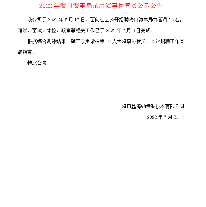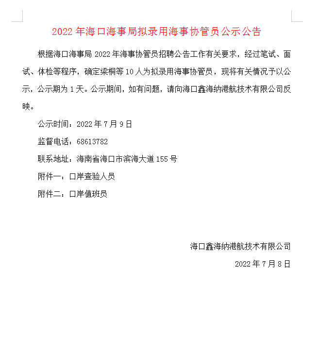 2022年海口海事局?jǐn)M錄用海事協(xié)管員公示公告根據(jù)??诤J戮?022年海事協(xié)管員招聘公告工作有關(guān)要求,經(jīng)過筆試、面試、體檢等程序,確定梁桐等10人為擬錄用海事協(xié)管員,現(xiàn)將有關(guān)情況...2022-07-08點(diǎn)擊:68 -