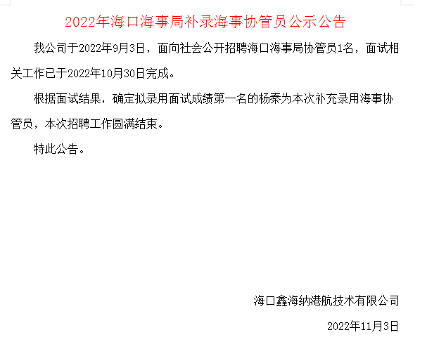 我公司于2022年9月3日,面向社會(huì)公開招聘??诤J戮謪f(xié)管員1名,面試相關(guān)工作已于2022年10月30日完成。根據(jù)面試結(jié)果,確定擬錄用面試成績第一名的楊秦為本次補(bǔ)充錄用海事協(xié)管...2022-11-03點(diǎn)擊:47 -